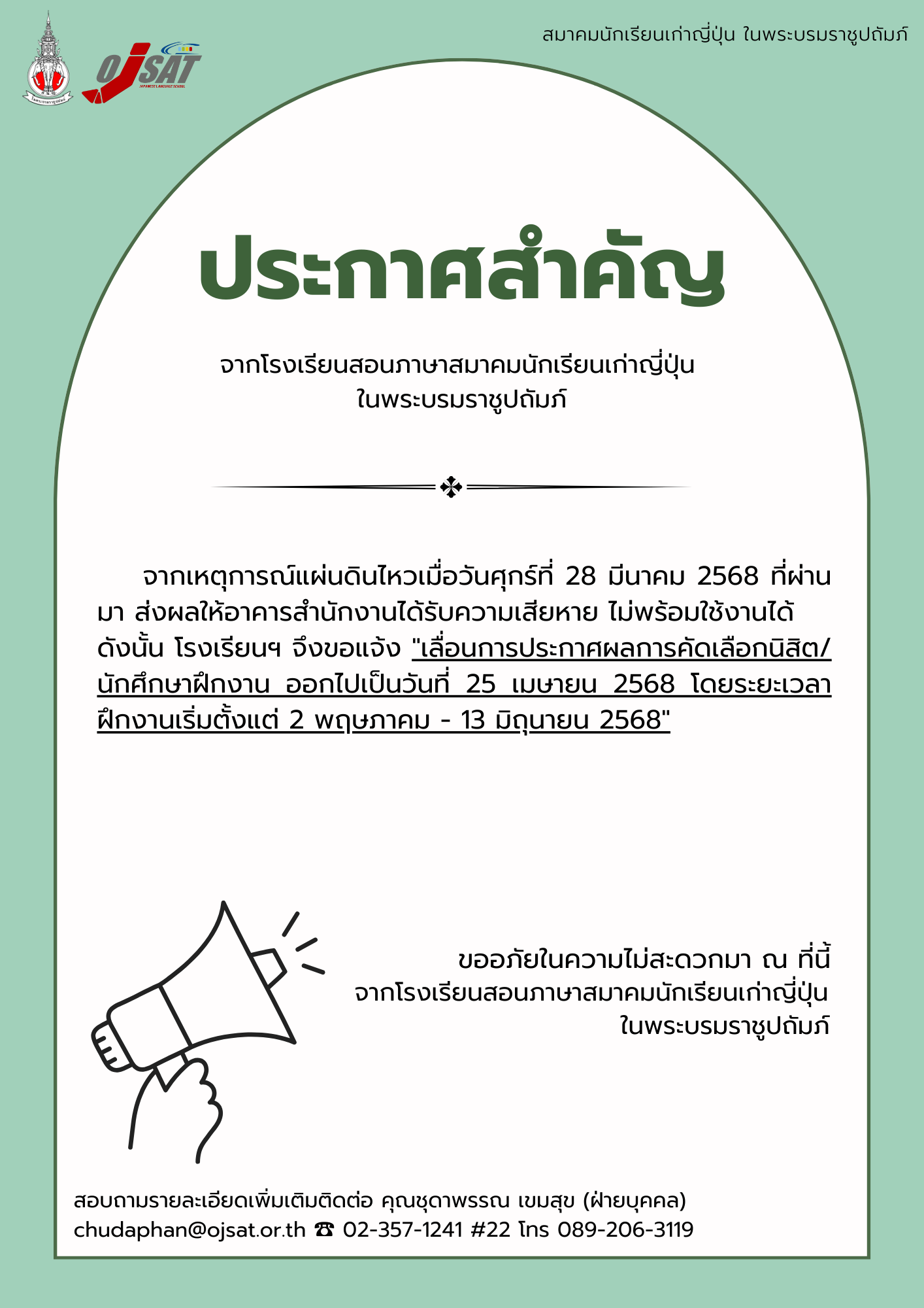 ดังนั้น โรงเรียนฯ จึงขอแจ้ง “เลื่อนการประกาศผลการคัดเลือกนิสิต/นักศึกษาฝึกงานออกไปเป็นวันที่ 25 เม.ย. 2568 โดยระยะเวลาฝึกงานเริ่มตั้งแต่ 2 พ.ค. ถึง 13 มิ.ย. 2568”