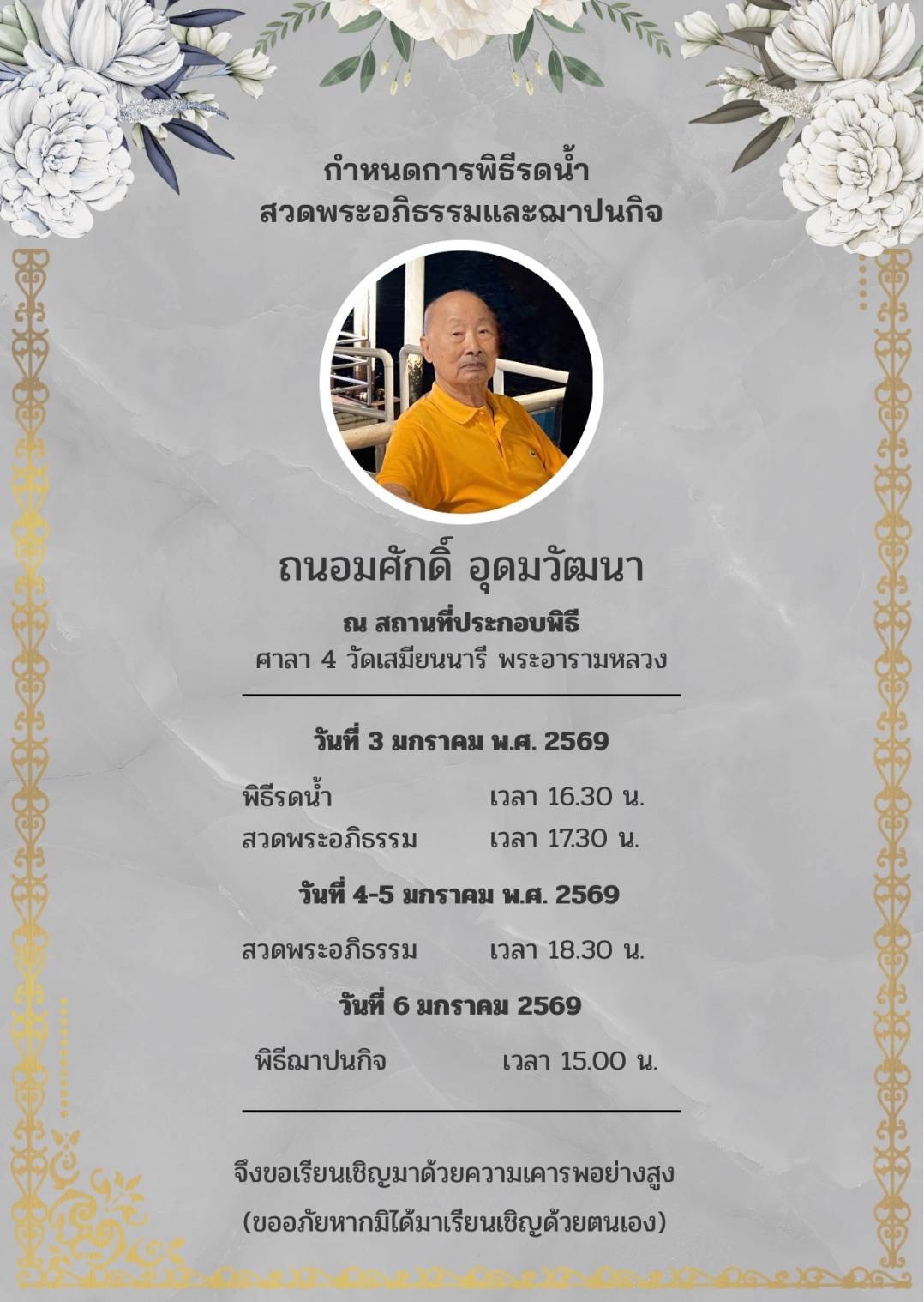 Newsขอแสดงความเสียใจ สมาคมนักเรียนเก่าญี่ปุ่นฯ ขอแสดงความเสียใจกับครอบครัวอุดมวัฒนา By admin - January 3, 2026 0 29 FacebookTwitterPinterestWhatsApp สมาคมนักเรียนเก่าญี่ปุ่นฯ ขอแสดงความเสียใจกับครอบครัวอุดมวัฒนา ที่ต้องสูญเสียคุณถนอมศักดิ์ อุดมวัฒนาทางสมาคมฯจะเป็นเจ้าภาพสวดพระอภิธรรมพี่ถนอมศักดิ์ อดีตกรรมการหลายสมัยในวันอาทิตย์ที่ 4 มกราคม ณ.วัดเสมียนนารีจึงเรียนมาเพื่อทราบ Bottom as