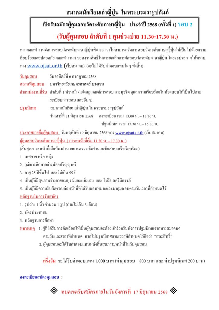 JLPT เปิดรับสมัครผู้คุมสอบวัดระดับภาษาญี่ปุ่น ครั้งที่ 1 ประจำปี 2568 (รับผู้คุมสอบ ลำดับที่ 1 เพิ่มเติม) By admin - May 29, 2025 0 FacebookTwitterPinterestWhatsApp ลงทะเบียนสมัครคุมสอบ : https://docs.google.com/forms/d/e/1FAIpQLSdSjp1gR_eWolBYX-KeLzlXdjwKP3Hwmc3PtfSpPBdFG2XLsg/viewform?usp=pp_url