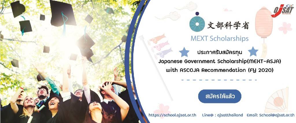 EducationsMEXT ประกาศรับสมัครทุน Japanese Government Scholarship (MEXT-ASJA) with ASCOJA Recommendation (FY 2020) By admin - May 21, 2019 0 FacebookTwitterPinterestWhatsApp 1 ประเภททุนนักศึกษาระดับปริญญาตรี (undergraduate) ไม่จำกัดสาขา 2 ประเภททุนศึกษาต่อระดับนักศึกษาวิจัย (RESEARCH STUDENTS)