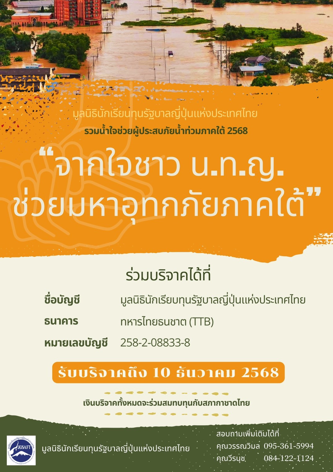 ชวนสมาชิกสมาคมนักเรียนเก่าญี่ปุ่นร่วมบริจาค “จากใจชาว น.ท.ญ ช่วยมหาอุทกภัยภาคใต้”