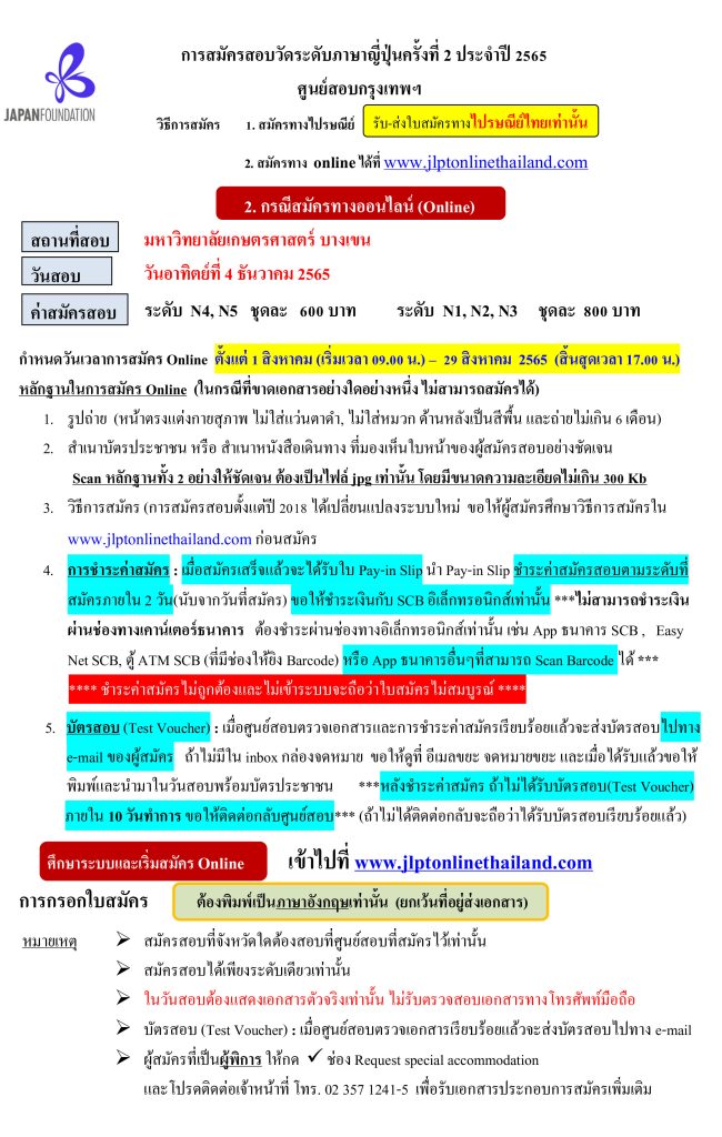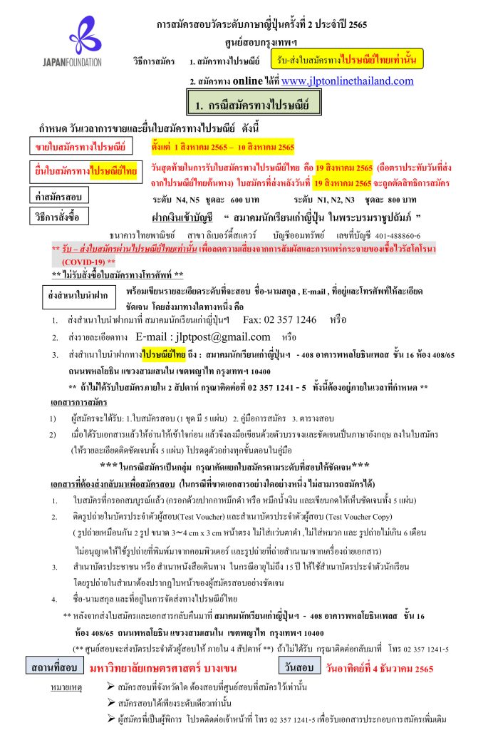 JLPT เปิดรับสมัครสอบวัดระดับภาษาญี่ปุ่น (JLPT) ครั้งที่ 2 ประจำปี2565 ศูนย์สมัครสอบกรุงเทพฯ By admin - July 24, 2022 0 FacebookTwitterPinterestWhatsApp ขายใบสมัคร-กทม-2022-ครั้งที่-2Download
