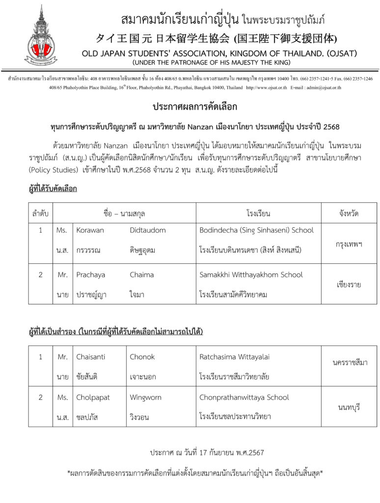 ด้วยมหาวิทยาลัย Nanzan เมืองนาโกยา ประเทศญี่ปุ่น ได้มอบหมายให้สมาคมนักเรียนเก่าญี่ปุ่น ในพระบรมราชูปถัมภ์ (ส.น.ญ.) เป็นผู้คัดเลือกนิสิตนักศึกษา/นักเรียน เพื่อรับทุนการศึกษาระดับปริญญาตรี สาขานโยบายศึกษา (Policy Studies) เข้าศึกษาในปี พ.ศ.2568 จำนวน 2 ทุน ส.น.ญ. ดังรายละเอียดต่อไปนี้