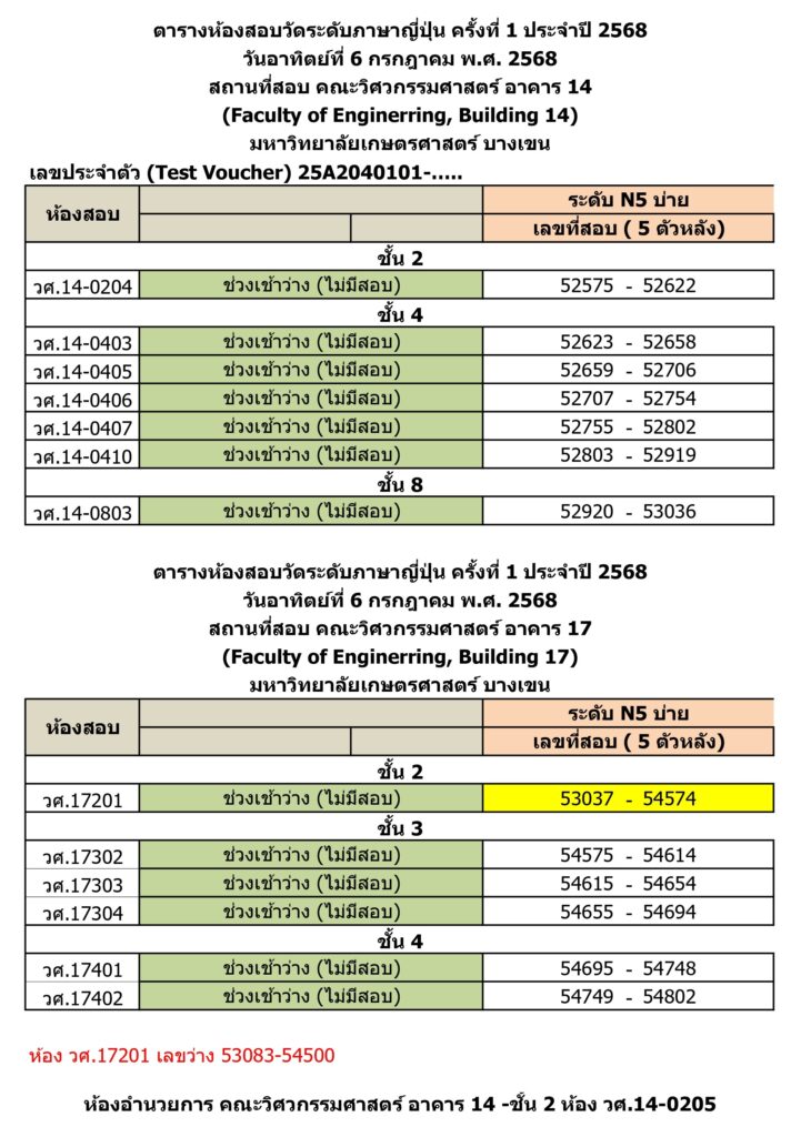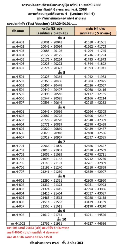 – การดูห้องสอบ JLPT ตัวอย่าง ศูนย์เรียนรวม 1 ชั้น 2 ห้องสอบ ศร.1-211 เลขที่สอบ 30982 – 31031 หมายถึง ผู้มีเลขสอบ ตั้งแต่ 30982 ถึง 31031 เข้าสอบที่ อาคารศูนย์เรียนรวม 1 ชั้น 2 ห้องสอบ ศร.1-211 หรือ ค้นหาห้องสอบจากตัวช่วยด้านล่าง โดยเลือกระดับที่สอบ และ ใส่เลขประจำตัวผู้สอบ 5 ตัวหลัง