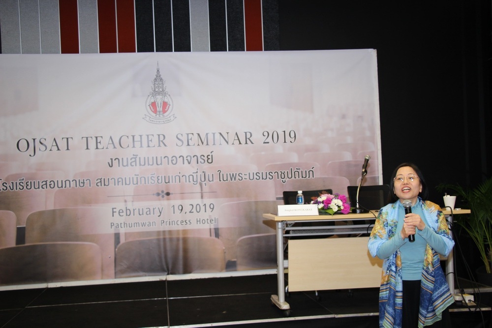เริ่มจาก อาจารย์ผุสดี นาวาวิจิต นายกสมาคมฯ กล่าวเปิดงาน ในงานสัมมนาฯ อาจารย์ Keiji OTAKE หัวหน้าฝ่ายวิชาการ OJSAT นำเสนอการสอนหนังสือแบบเรียน “มะรุโกะโตะ ภาษาและวัฒนธรรมญี่ปุ่น” และอาจารย์ Satoshi SEKIYAMA และ อาจารย์ฑริกติมา เลิศกิจลักษณ์ อาจารย์จาก JAPAN FOUNDATION นำเสนอ “การจัดทำคอร์สเรียนภาษาญี่ปุ่นออนไลน์ Minato (คอร์สเรียนด้วยตนเอง) เพื่อผู้เรียนชาวไทย” และอาจารย์จงกล คงคารัตน์ อาจารย์พิเศษจากสมาคมส่งเสริมเทคโนโลยีไทย-ญี่ปุ่น นำเสนอ “สาธิตวิธีการสอนคอร์สออนไลน์โดยใช้หนังสือแบบเรียน มินนะ โนะ นิฮงโกะ และ มะรุโกะโตะ ภาษาและวัฒนธรรมญี่ปุ่น”