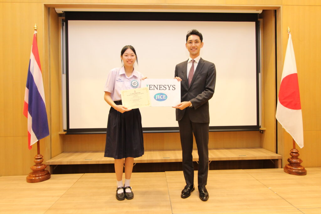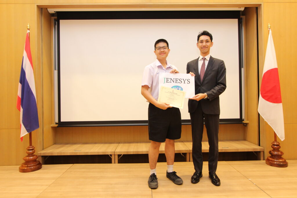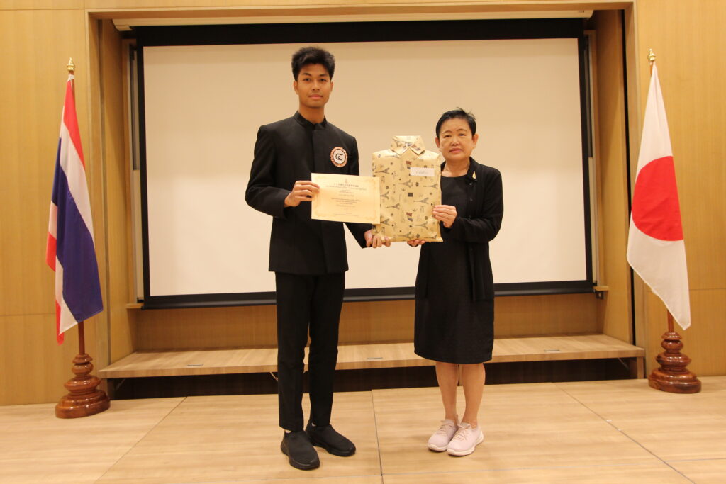 นายเจตมัย เกษตระทัต จากโรงเรียน โรงเรียนสาธิตจุฬาลงกรณ์มหาวิทยาลัย หัวข้อ 「歌舞歓楽」:こんなに頑張るのは 何故?”คาบุคังระคุ” : เหตุใดเราจึงพยายาม ?