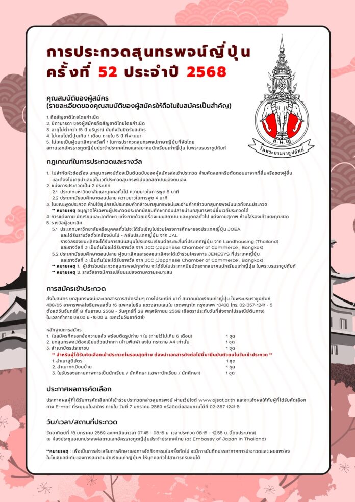เปิดรับสมัครผู้เข้าประกวดสุนทรพจน์ภาษาญี่ปุ่น ครั้งที่ 52 ประจำปี พ.ศ.2568