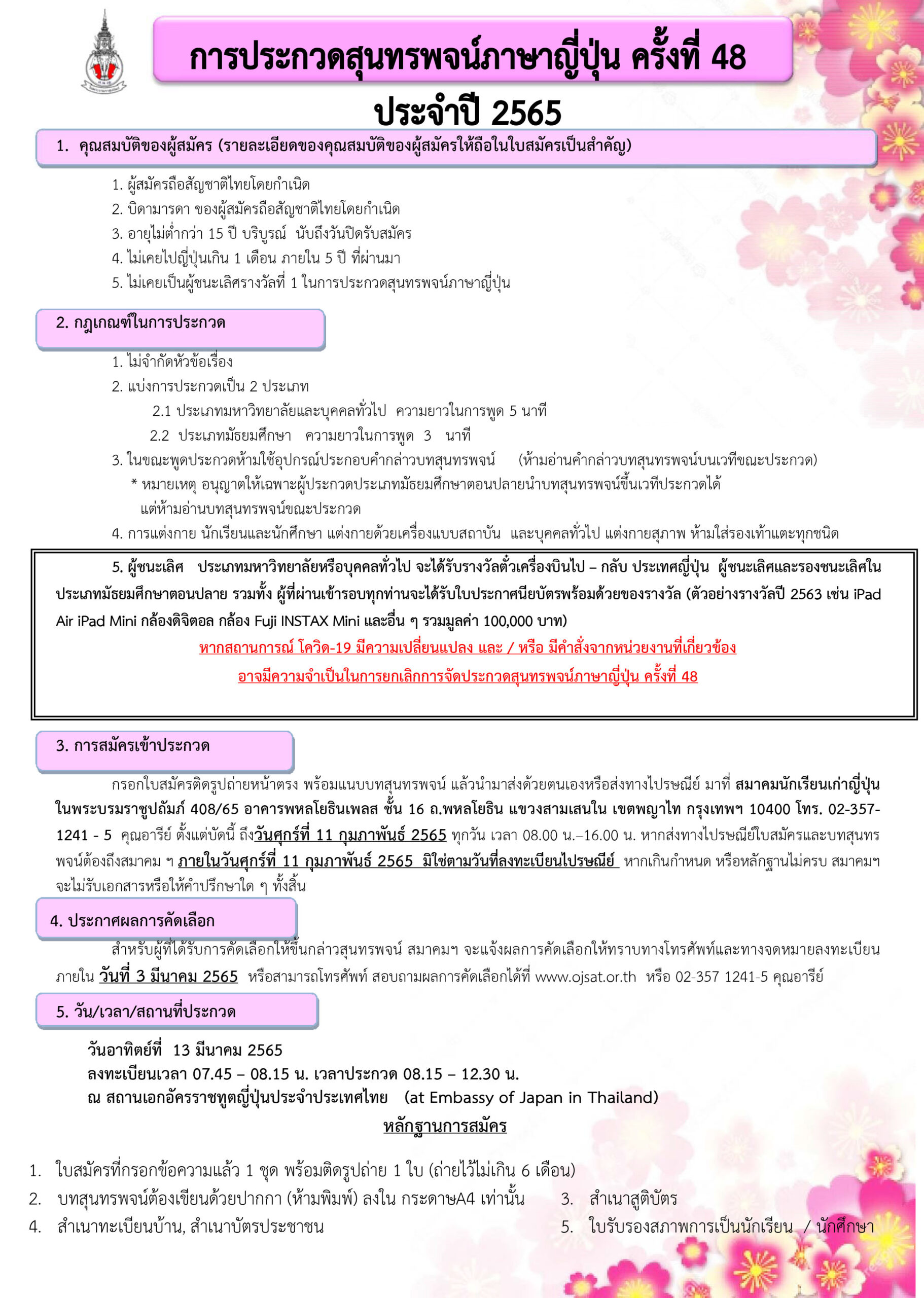 NewsAnoneClubประกวดสุนทรพจน์ รับสมัคร การประกวดสุนทรพจน์ภาษาญี่ปุ่น ครั้งที่ 48 ปี 2021 By admin - January 14, 2022 0 FacebookTwitterPinterestWhatsApp รายละเอียดการสมัครสุนทรพจน์ ครั้งที่ 48 ปี 2021 ใบสมัครสุนทรพจน์-64Download